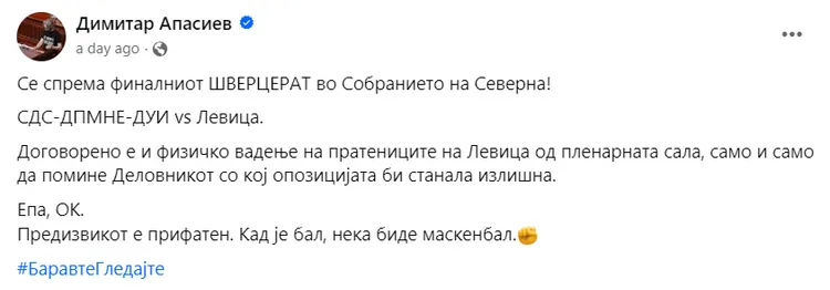 Димитар Апасиев дури напиша „Предизвикот е прифатен.“ како што може да се види на сликата погоре. Испадна дека сепак не било така, затоа што ултимативно не дојде до физичко исфрлање на пратениците од Љевиц од пленарната сала, примарно затоа што самите тие не дозволија да дојде до тоа, затоа што дисциплинирано си седнаа на своите столици и гласаа против, со што се заврши епизодата на „опструкција“.